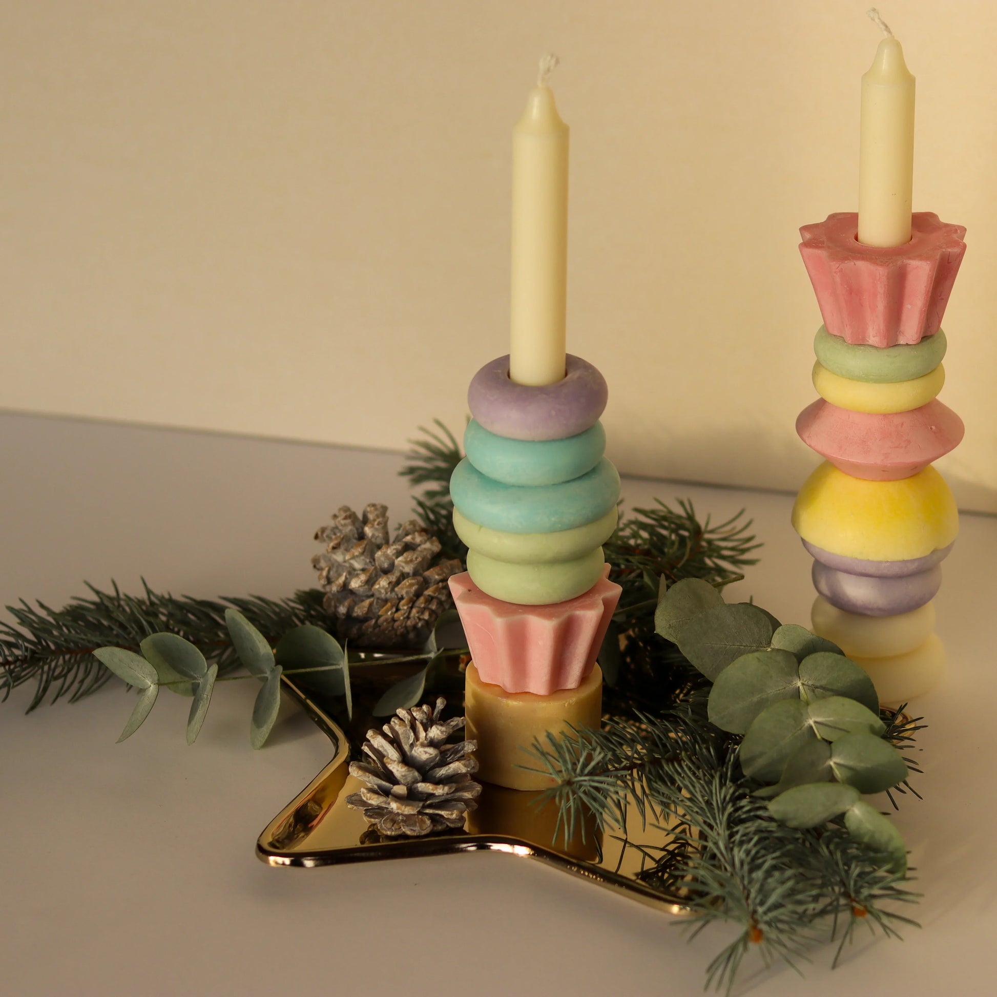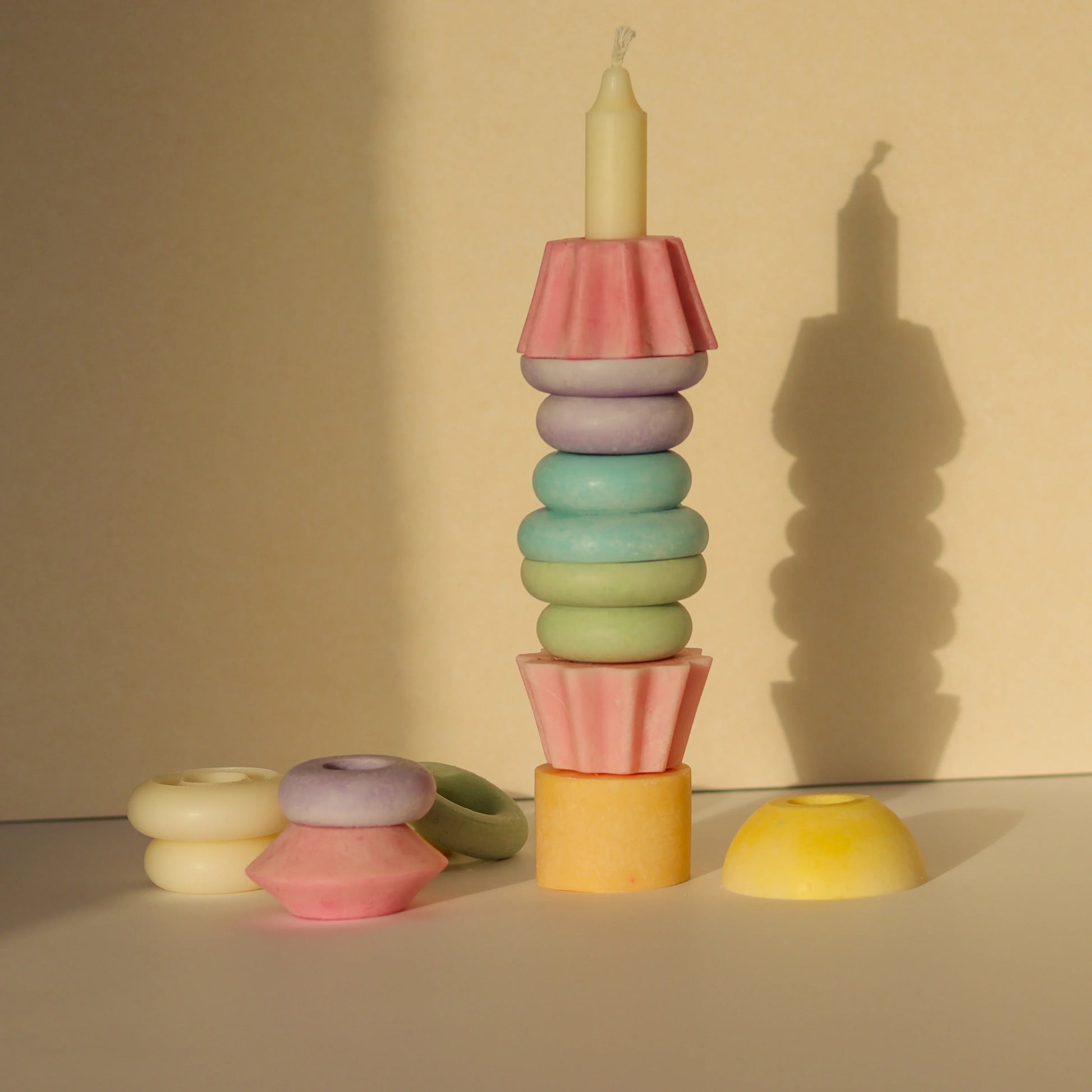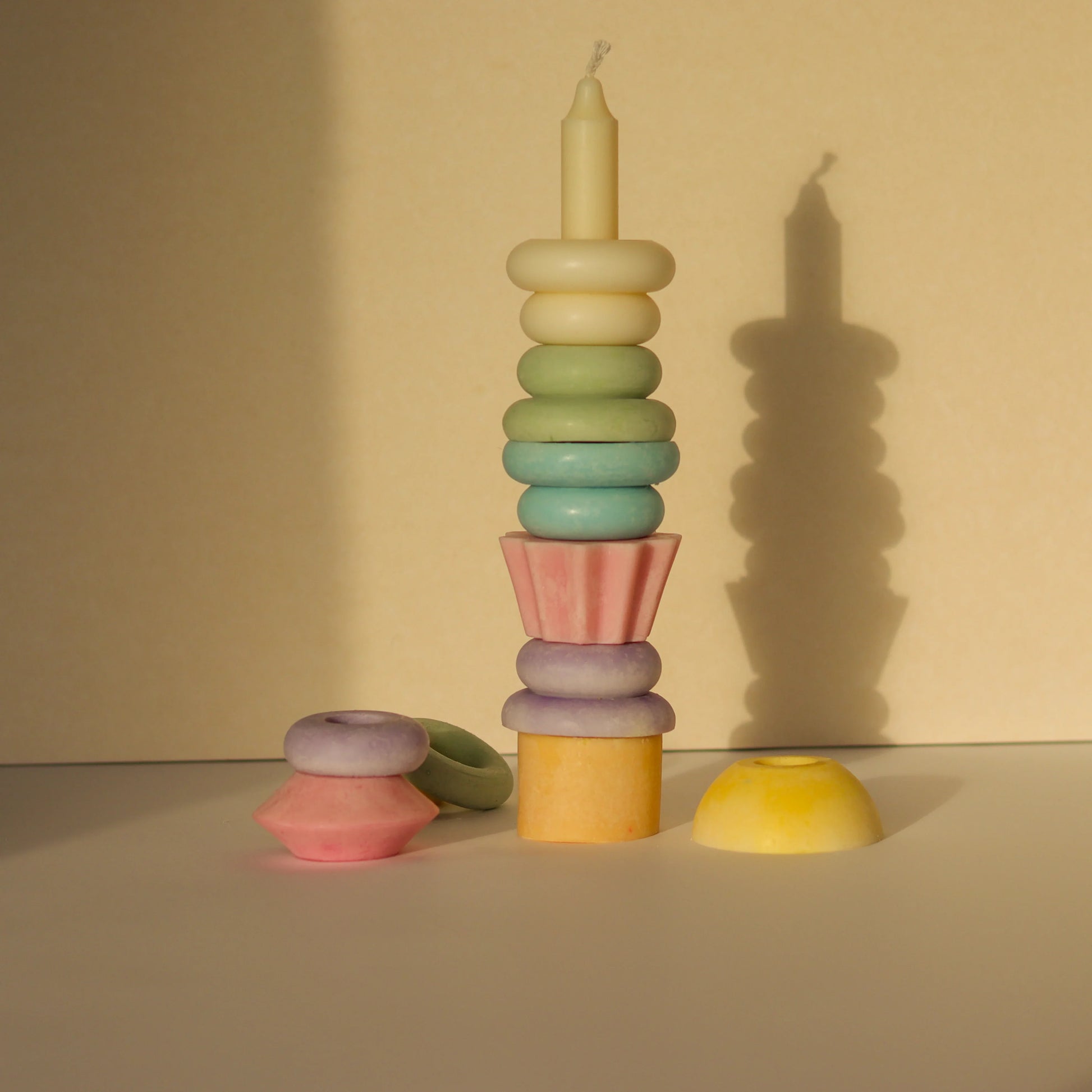 Styling your Nolve candle is easy and fun. You can stack the rings in any order, mix colors, or change the height to suit the occasion. Use it as a unique centerpiece or pair it with other sculptural candles for a curated look.